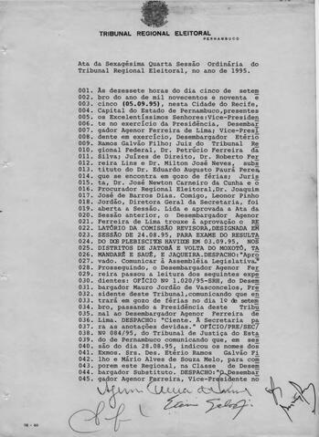 Ata da Sexagésima Quarta Sessão Ordinária do Tribunal Regional Eleitoral de Pernambuco, no ano de 1995.