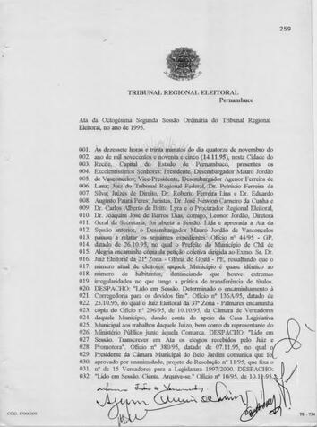 Ata da Octogésima Segunda Sessão Ordinária do Tribunal Regional Eleitoral de Pernambuco, no ano de 1995.