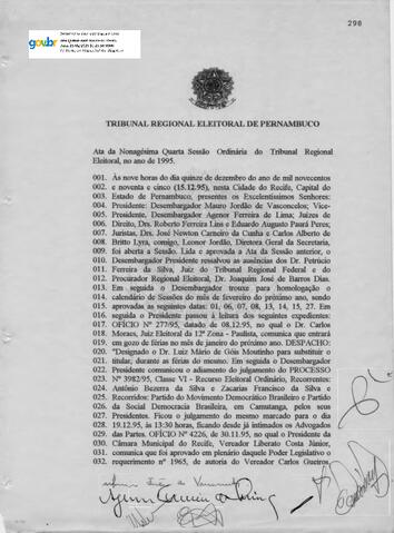 Ata da Nonagésima Quarta Sessão Ordinária do Tribunal Regional Eleitoral de Pernambuco, no ano de 1995.