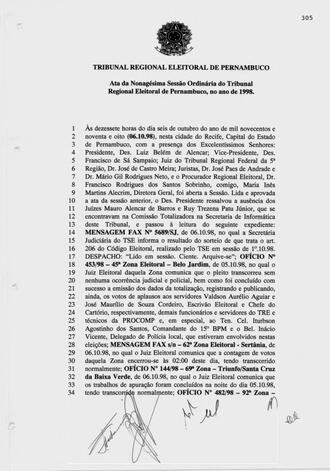 Ata da Nonagésima Sessão Ordinária do Tribunal Regional Eleitoral de Pernambuco, no ano de 1998.