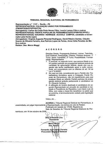 - No caso em tela, considerando que o Partido dos Trabalhadores formalizou apoio à Coligação Frente Popular de Pernambuco, não há impedimento para que qualquer filiado ao referido Partido participe da propaganda eleitoral gratuita pertencente à candidatura do Sr. Eduardo Campos;