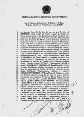 Ata da Vigésima Sétima Sessão Ordinária do Tribunal Regional Eleitoral de Pernambuco, no ano de 2000.